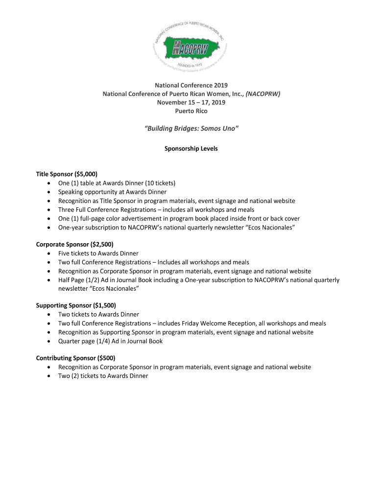 National Conference 2019 National Conference of Puerto Rican Women, Inc., (ACORN) November 15 17, 2019 Puerto Rebuilding Bridges: Solos UNO Sponsorship LevelsTitle Sponsor ($5,000) One (1) table at