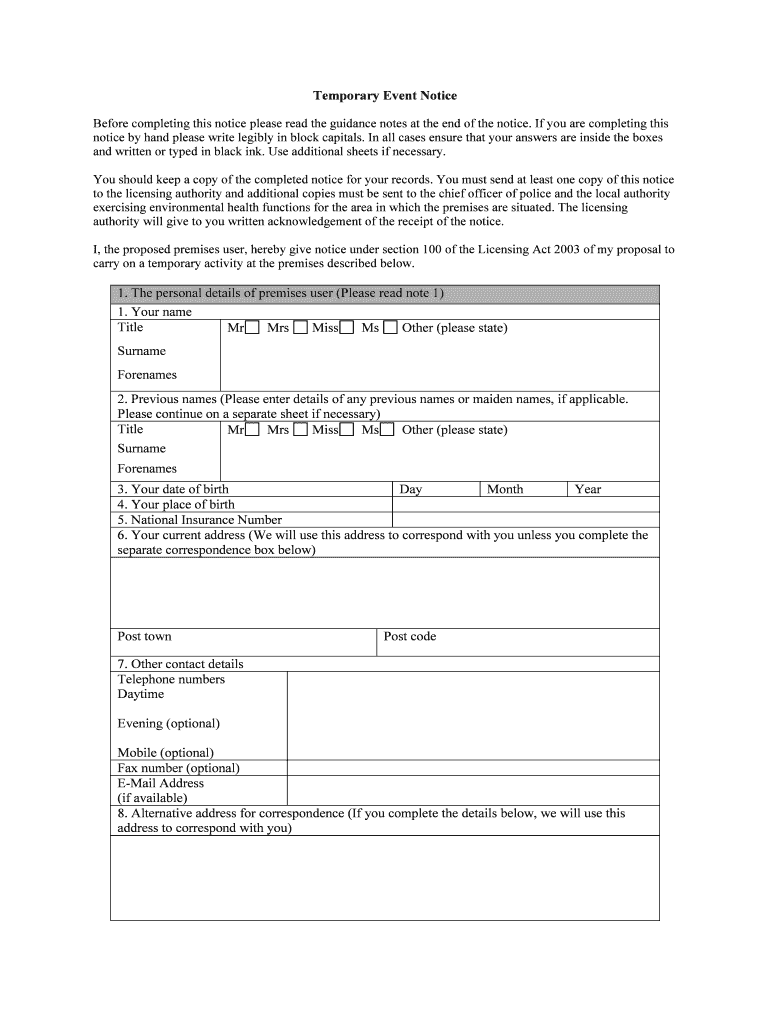 Get the free Temporary Event Notice Form