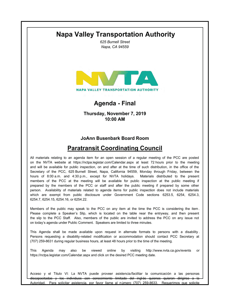 Napa Valley Transportation Authority 625 Burn ell Street Napa, CA 94559Agenda Final Thursday, November 7, 2019 10:00 Joann Disembark Board RoomParatransit Coordinating Council All materials relating
