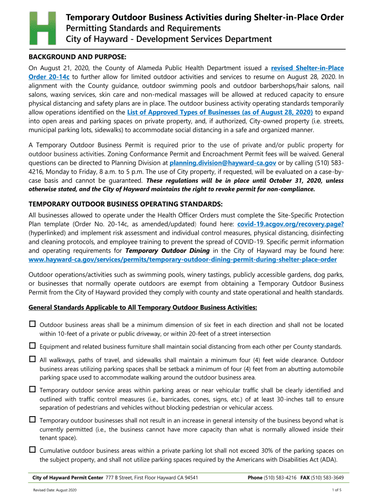 Temporary Outdoor Business Activities during ShelterinPlace Order Permitting Standards and Requirements City of Hayward Development Services Department BACKGROUND AND PURPOSE: On August 21, 2020,