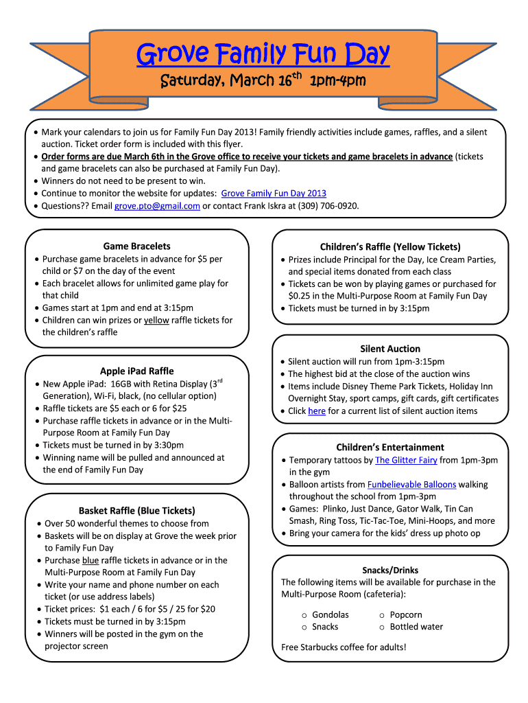 Grove Family Fun Day Saturday, March 16th 1pm-4pm ? Mark your calendars to join us for Family Fun Day 2013! Family friendly activities include games, raffles, and a silent auction. Ticket order form