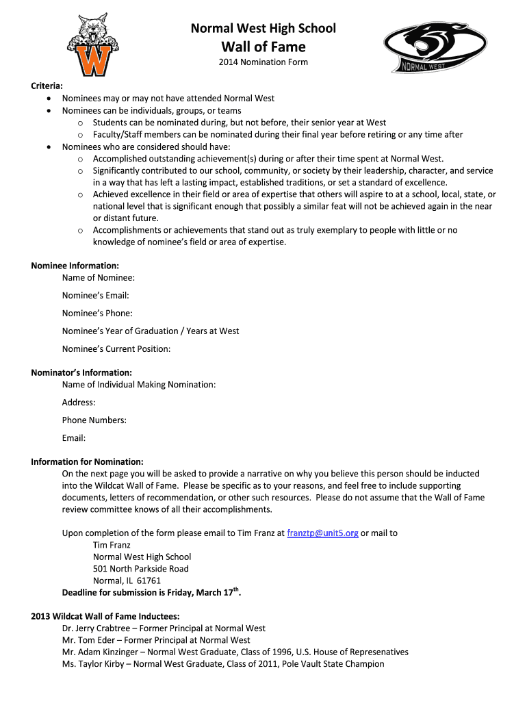 Normal West High School Wall of Fame 2014 Nomination Form Criteria: ? Nominees may or may not have attended Normal West ? Nominees can be individuals, groups, or teams o Students can be nominated