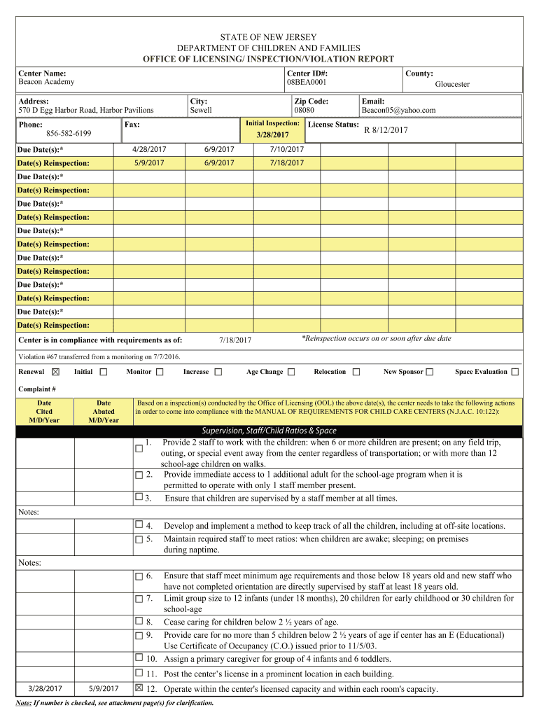 OFFICE OF LICENSING/ INSPECTION/VIOLATION REPORT