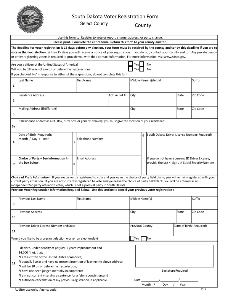 South Dakota Voter Registration Form Select County Use this form to: Register to vote or report a name, address, or party change. Please print. Complete the entire form. Return this form to your county