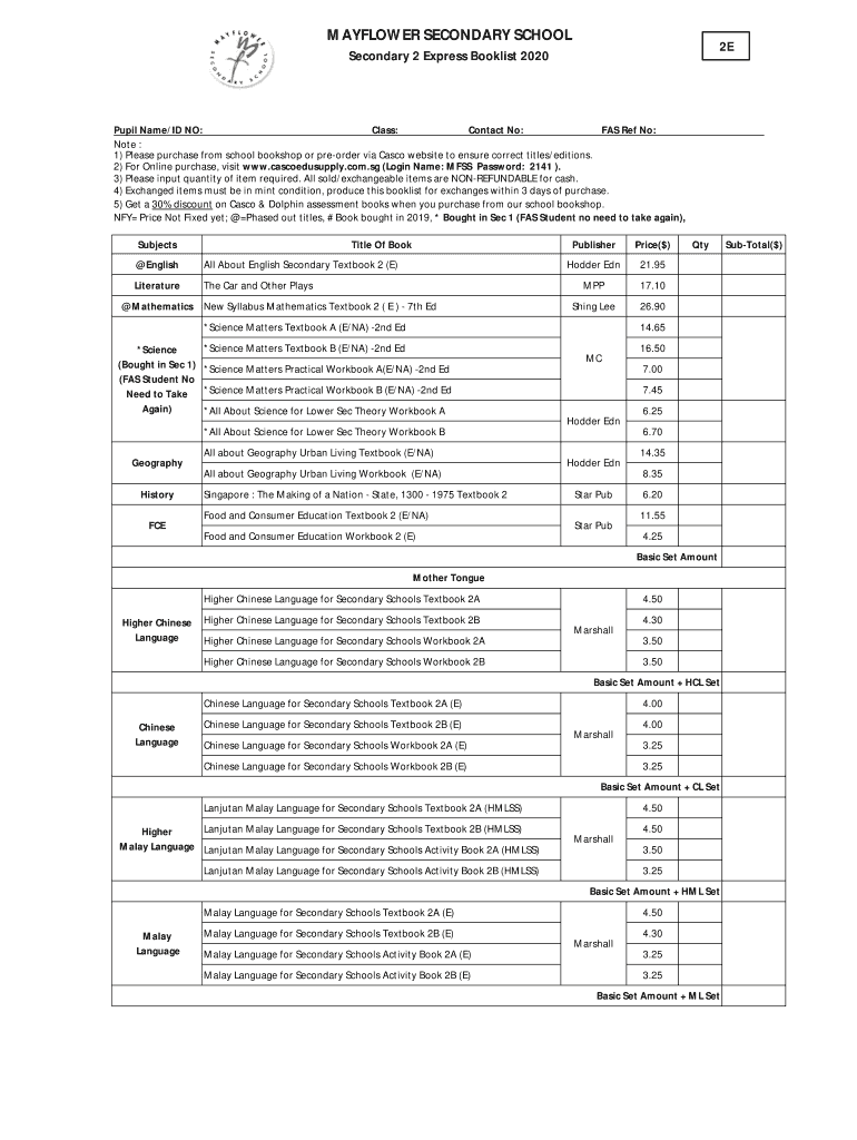 MAYFLOWER SECONDARY SCHOOL2ESecondary 2 Express Book list 2020Pupil Name/ID NO: