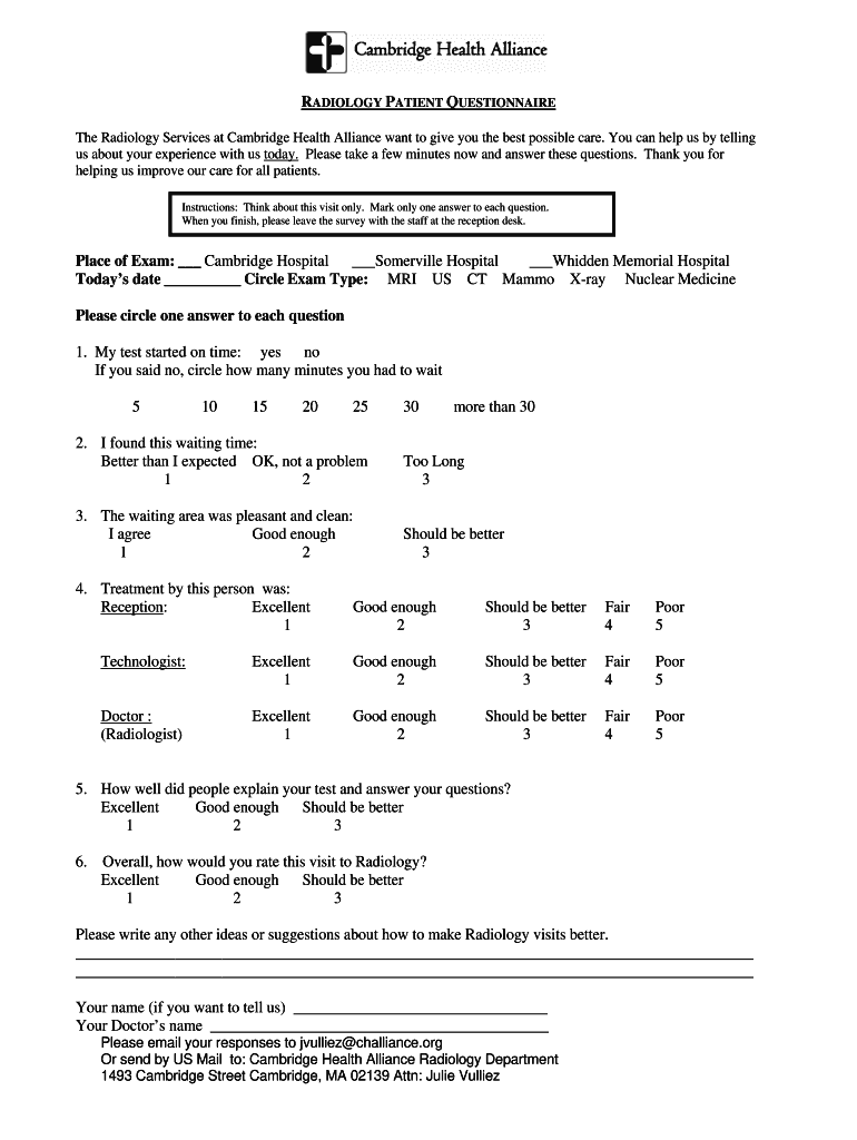 Get the free radiology patient questionnaire - Cambridge Health Alliance