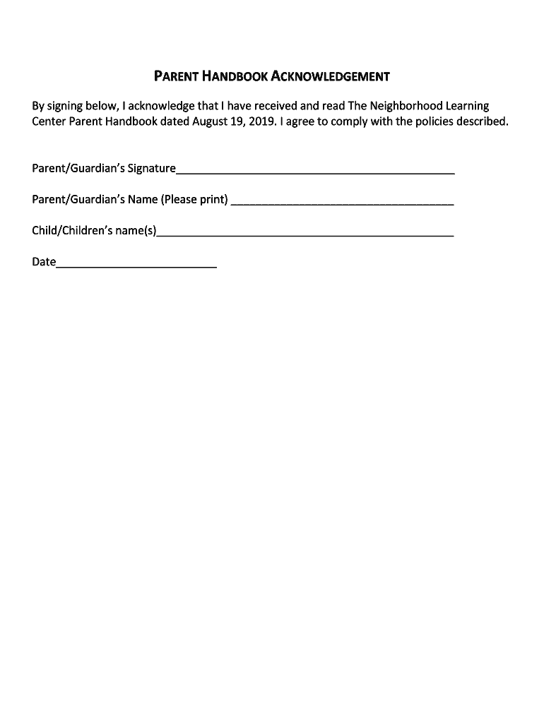 PARENT HANDBOOK ACKNOWLEDGEMENT By signing below, I acknowledge that I have received and read The Neighborhood Learning Center Parent Handbook dated August 19, 2019. I agree to comply with the policies