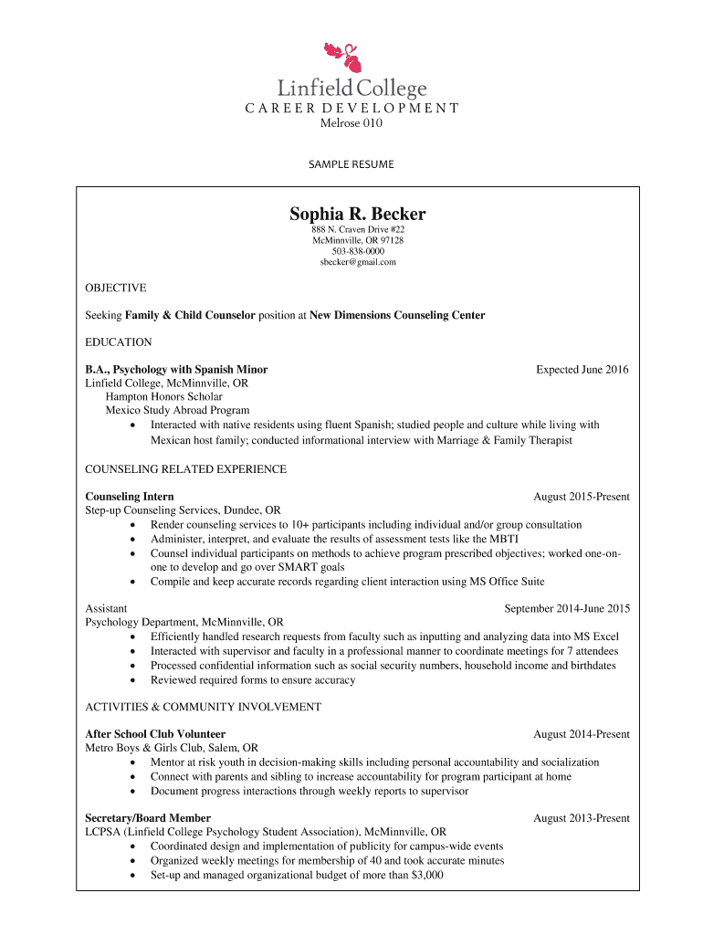 CAREER DEVELOPMENT Melrose 010SAMPLE RESUME Sophia R. Becker 888 N. Craven Drive #22 McMinnville, OR 97128 5038380000 Becker Gmail. Nonobjective Seeking Family & Child Counselor position at New Dimensions