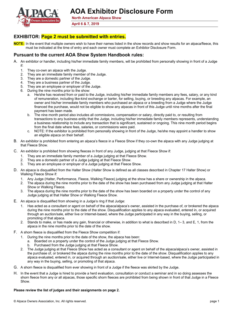 AOA Exhibitor Disclosure Form North American Alpaca Show April 6 & 7, 2019 EXHIBITOR: Page 2 must be submitted with entries. NOTE: In the event that multiple owners wish to have their names listed