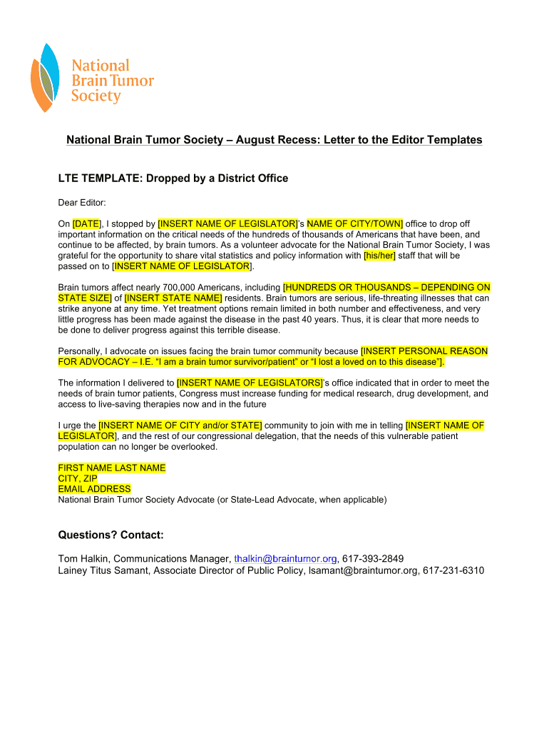 National Brain Tumor Society August Recess: Letter to the Editor Templates LTE TEMPLATE: Dropped by a District Office Dear Editor: On DATE, I stopped by INSERT NAME OF LEGISLATOR s NAME OF CITY/TOWN
