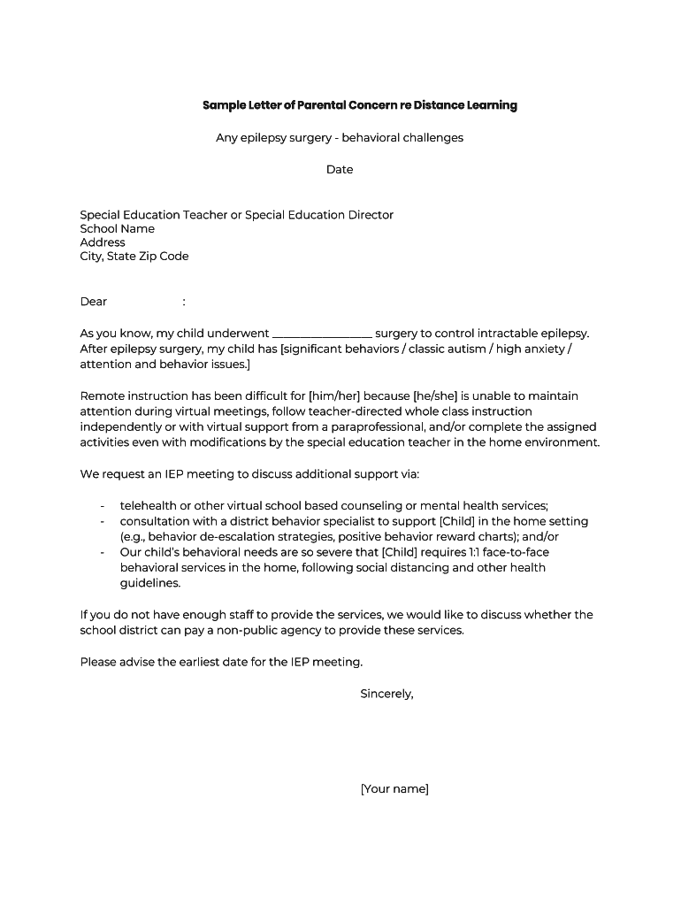 Sample Letter of Parental Concern re Distance Learning Any epilepsy surgery behavioral challenges Date Special Education Teacher or Special Education Director School Name Address City, State Zip Code