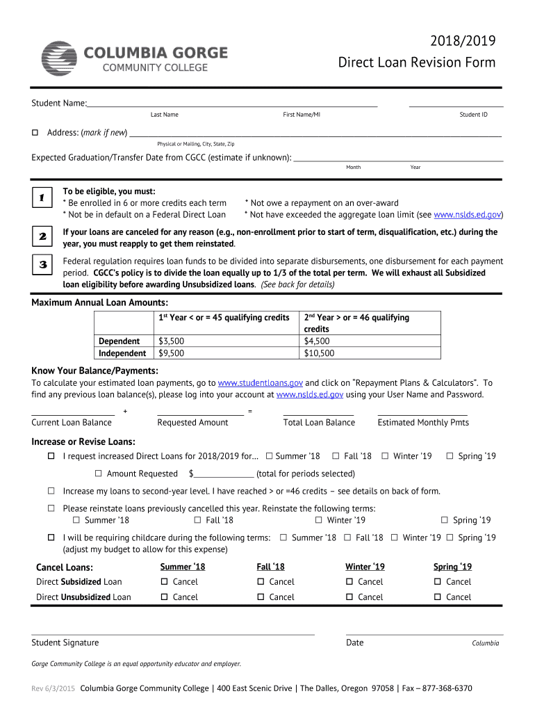 2018/2019 Direct Loan Revision Form Student Name: Last NameFirst Name/Student Address: (mark if new) Physical or Mailing, City, State, Expected Graduation/Transfer Date from CCC (estimate if unknown):