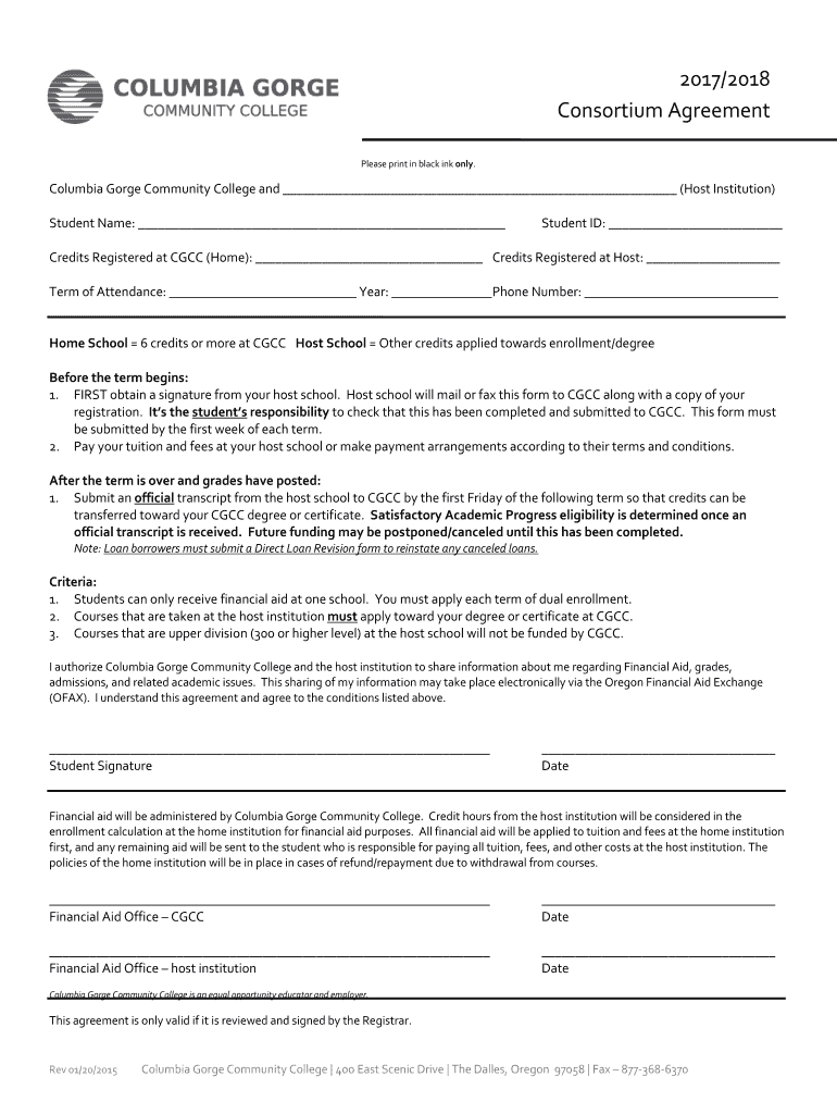 2017/2018 Consortium Agreement Please print in black ink only. Columbia Gorge Community College and (Host Institution) Student Name: Student ID: Credits Registered at CCC (Home): Credits Registered