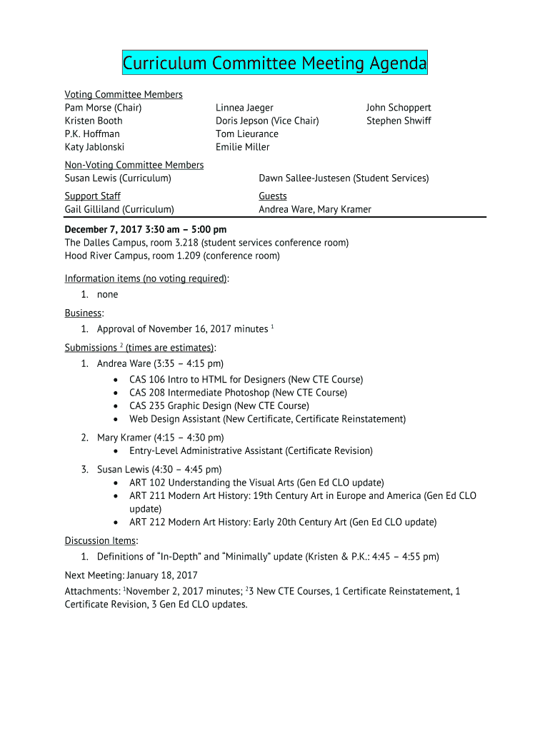 Curriculum Committee Meeting Agenda Voting Committee Members Pam Morse (Chair) Kristen Booth P.K. Hoffman Katy JablonskiLinnea Jaeger Doris Epson (Vice Chair) Tom Insurance Emilie Miller John Shoppers