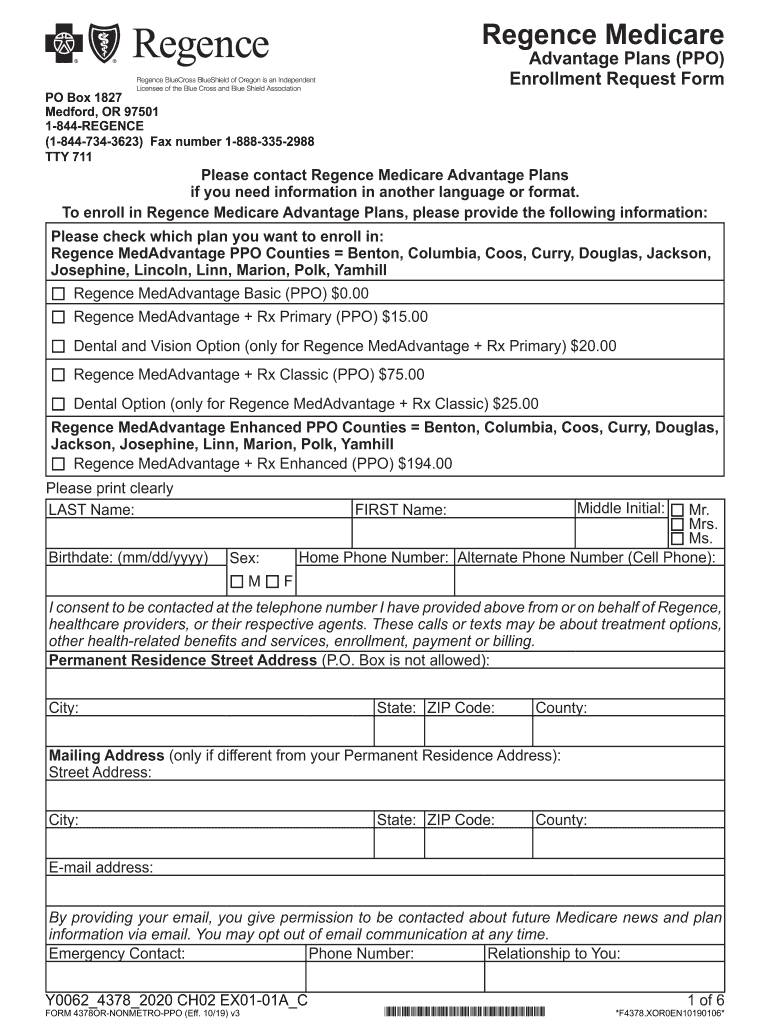 Get the free 2020 Regence BlueCross BlueShield of Oregon Medicare Advantage Plans (PPO) Enrollmen...