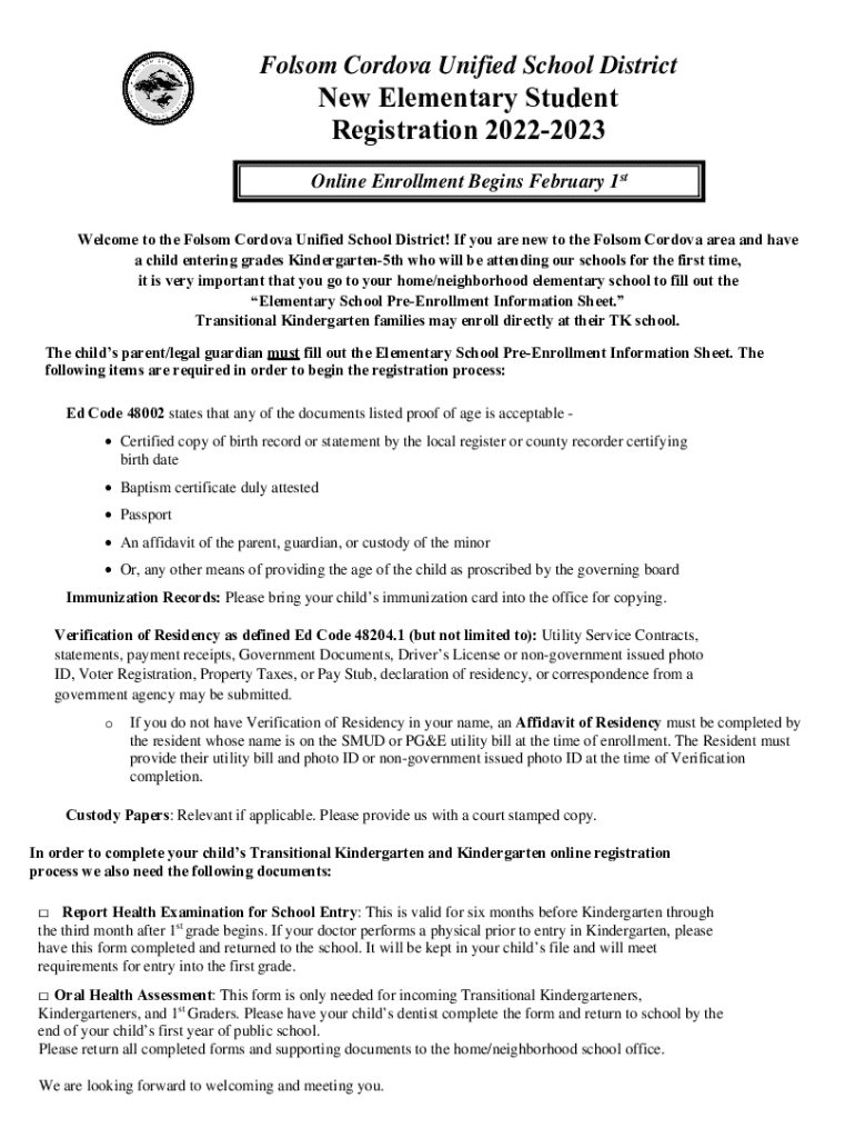 Get the free Registration Forms - Folsom Cordova Unified School District - fcusd
