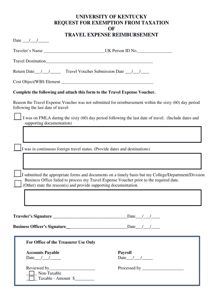 UNIVERSITY OF KENTUCKY REQUEST FOR EXEMPTION FROM TAXATION OF TRAVEL EXPENSE REIMBURSEMENTClearDate / / Travelers Name UK Person ID No. Travel Destination Return Date / / Travel Voucher Submission