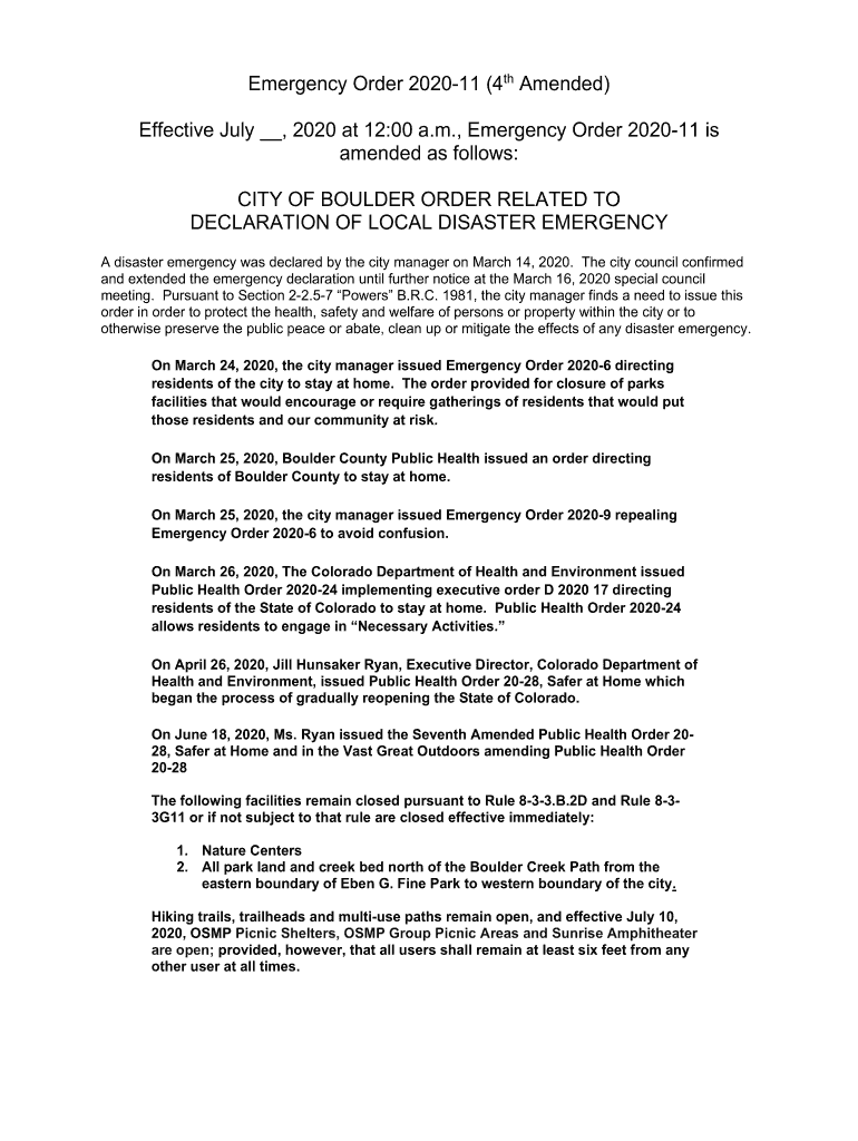 Emergency Order 202011 (4th Amended) Effective July 2020 at 12:00 a.m., Emergency Order 202011 is amended as follows: CITY OF BOULDER ORDER RELATED TO DECLARATION OF LOCAL DISASTER EMERGENCY A disaster