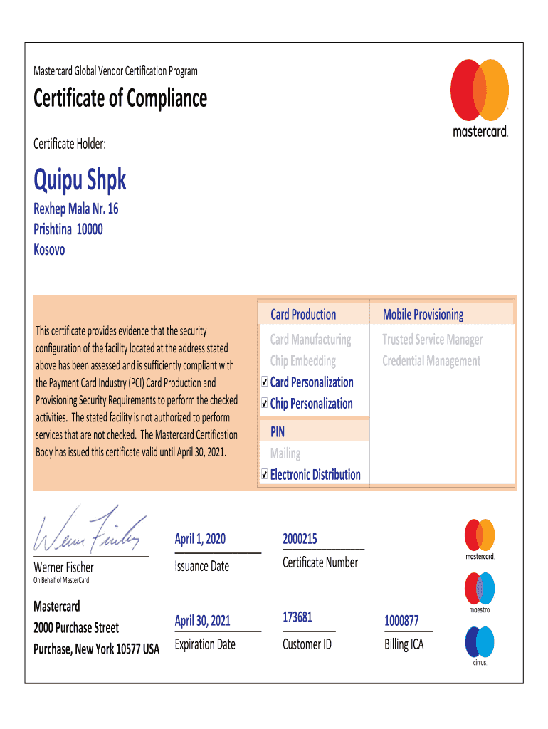 Mastercard Global Vendor Certification ProgramCertificate of Compliance