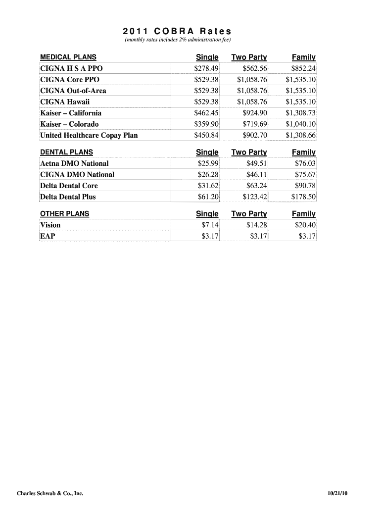 2011 COBRA Rates monthly rates includes 2 administration fee MEDICAL PLANS CIGNA H S A PPO CIGNA Core PPO CIGNA Out-of-Area CIGNA Hawaii Kaiser California Kaiser Colorado United Healthcare Copay Plan DENTAL PLANS Aetna DMO National CIGNA DMO National Delta Dental Core Delta Dental Plus OTHER PLANS Vision EAP Charles Schwab Co. Inc* Single 278. 49 529. 38 462. 45 359. 90 450. 84 Two Party 562. 56 1 058. 76 924. 90 719. 69 902. 70 Family 852. 24 1 535. 10 1 308. 73 1 040. 10 1 308. 66 25....