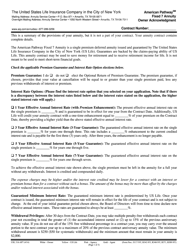 The United States Life Insurance Company in the City of New York Mailing Address: Annuity Service Center P.O. Box 871 Amarillo, TX 79105-0871 Overnight Mailing Address: Annuity Service Center 1050