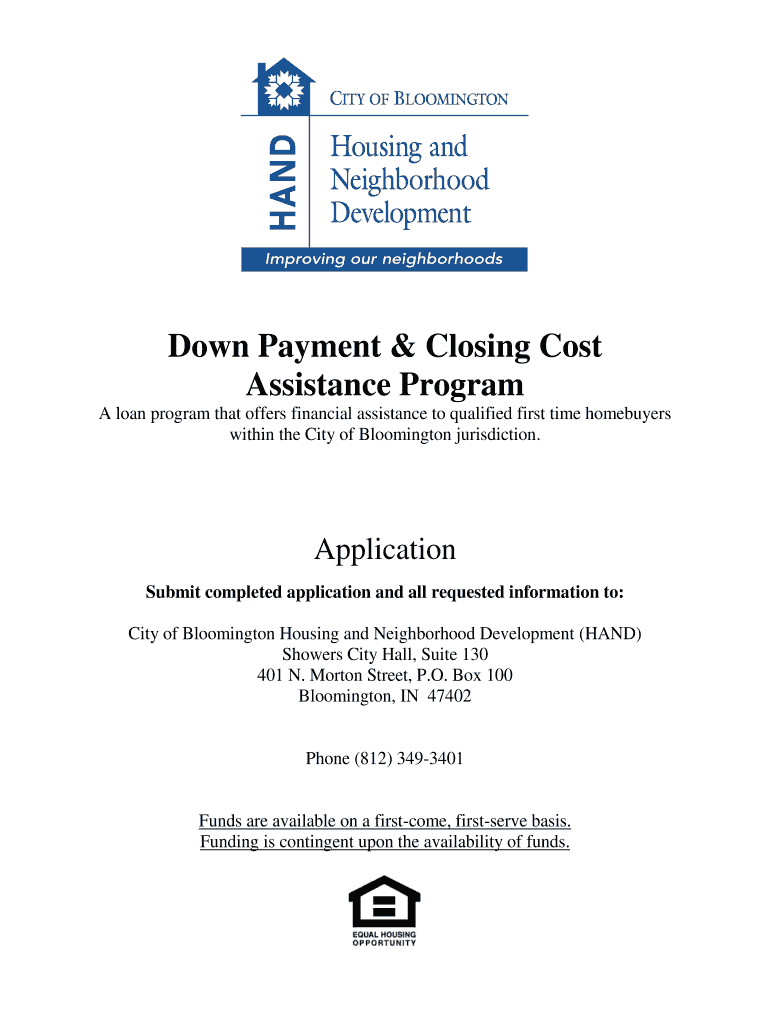Down Payment & Closing Cost Assistance Program A loan program that offers financial assistance to qualified first time homebuyers within the City of Bloomington jurisdiction. Application Submit completed