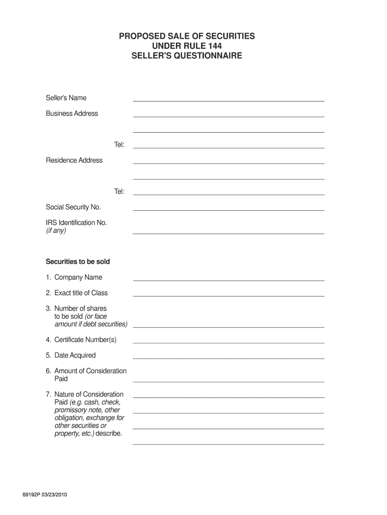 The Rule 144 Seller's Questionnaire is a legal form used by sellers of securities to disclose details about the securities they plan to sell.
