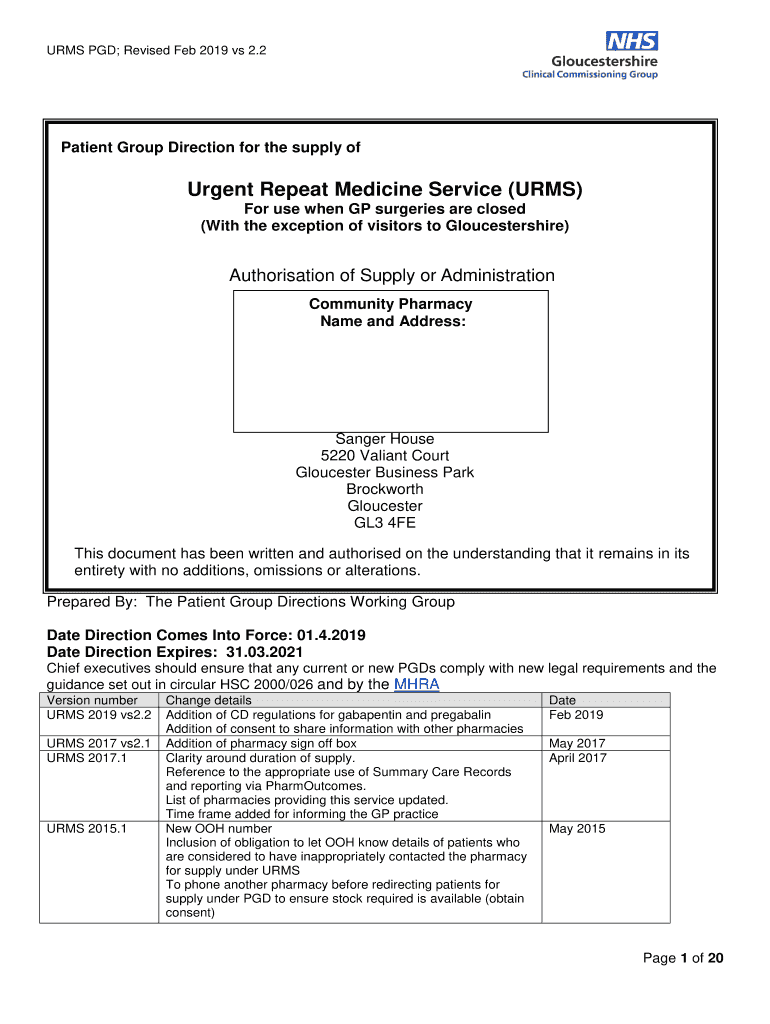 ARMS PGD; Revised Feb 2019 vs 2.2Patient Group Direction for the supply urgent Repeat Medicine Service (ARMS)