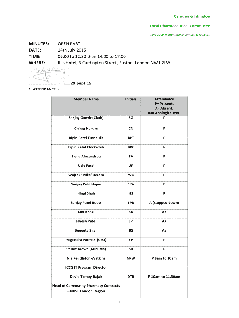 Camden & Arlington Local Pharmaceutical Committee .the voice of pharmacy in Camden & IslingtonMINUTES: DATE: TIME: WHERE:OPEN PART 14th July 2015 09.00 to 12.30 then 14.00 to 17.00 Ibis Hotel, 3 Carding