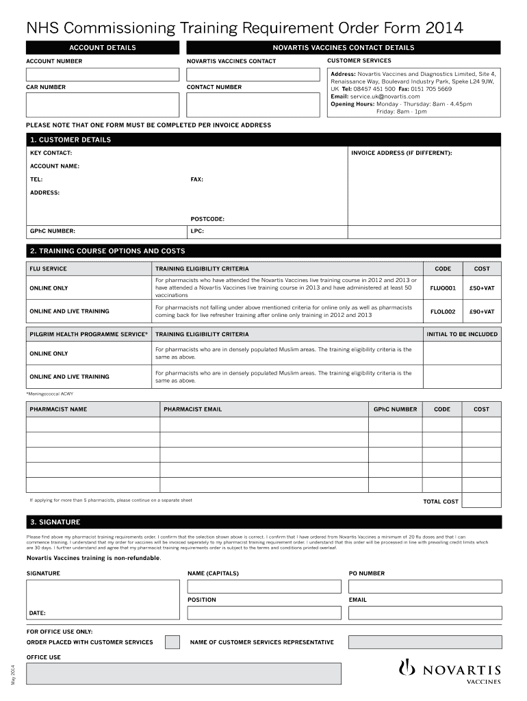 NHS Commissioning Training Requirement Order Form 2014 ACCOUNT DETAILSNOVARTIS VACCINES CONTACT DETAILSACCOUNT NUMBERNOVARTIS VACCINES CONTACTOR NUMBERCONTACT NUMBERCUSTOMER SERVICES Address: Novartis