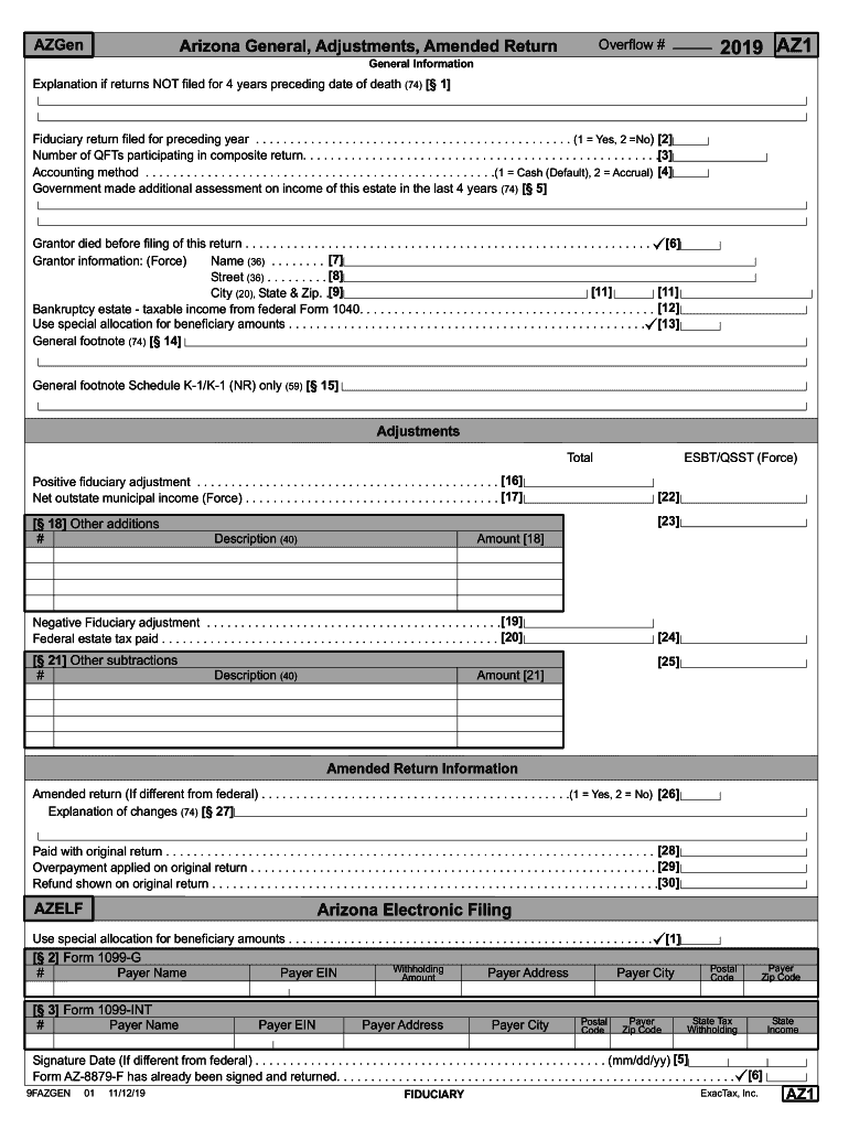 AZGen2019 AZ1Overflow #Arizona General, Adjustments, Amended Return General InformationExplanation if returns NOT filed for 4 years preceding date of death (74) 1 Fiduciary return filed for preceding