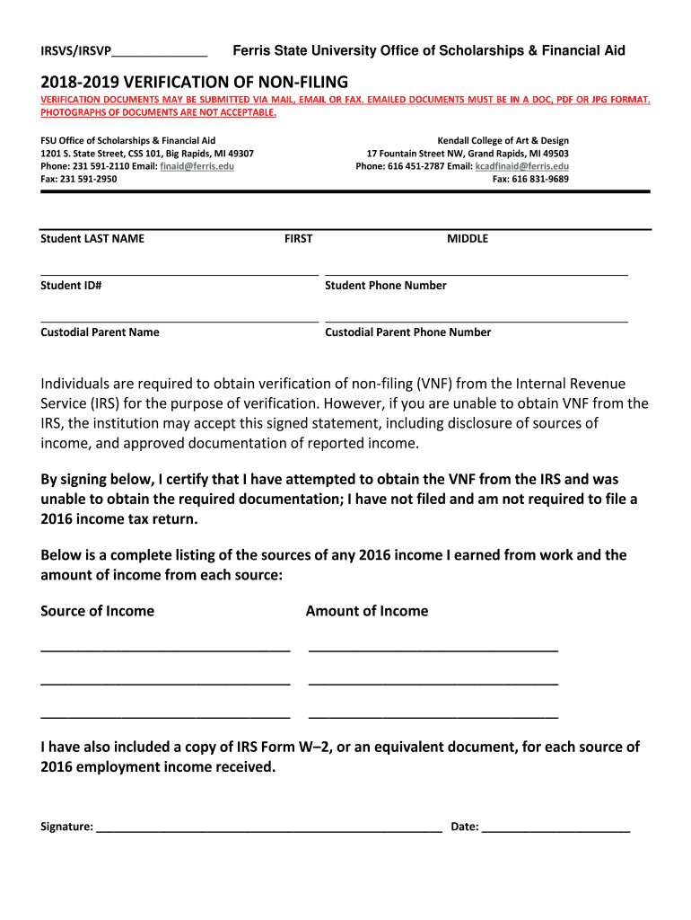 IRS/RSVP Ferris State University Office of Scholarships & Financial Aid20182019 VERIFICATION OF NONFILINGVERIFICATION DOCUMENTS MAY BE SUBMITTED VIA MAIL, EMAIL OR FAX. EMAILED DOCUMENTS MUST BE IN