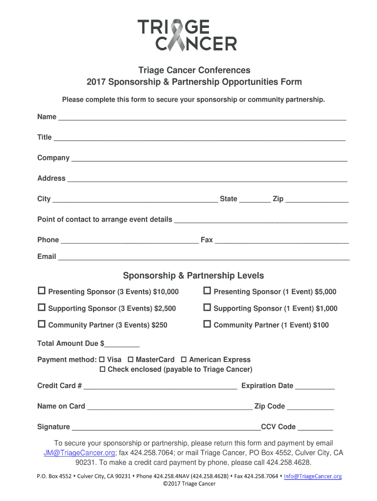 Triage Cancer Conferences 2017 Sponsorship & Partnership Opportunities Form Please complete this form to secure your sponsorship or community partnership. Name Title Company Address City State Zip