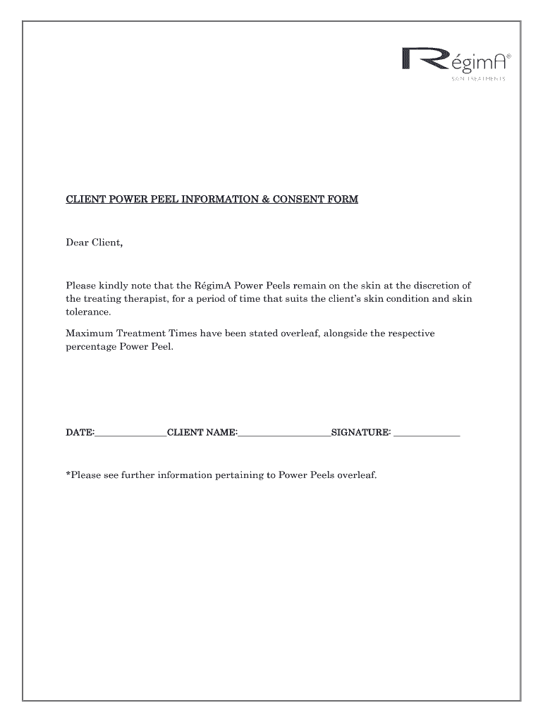 CLIENT POWER PEEL INFORMATION & CONSENT Former Client, Please kindly note that the RIMA Power Peels remain on the skin at the discretion of the treating therapist, for a period of time that suits