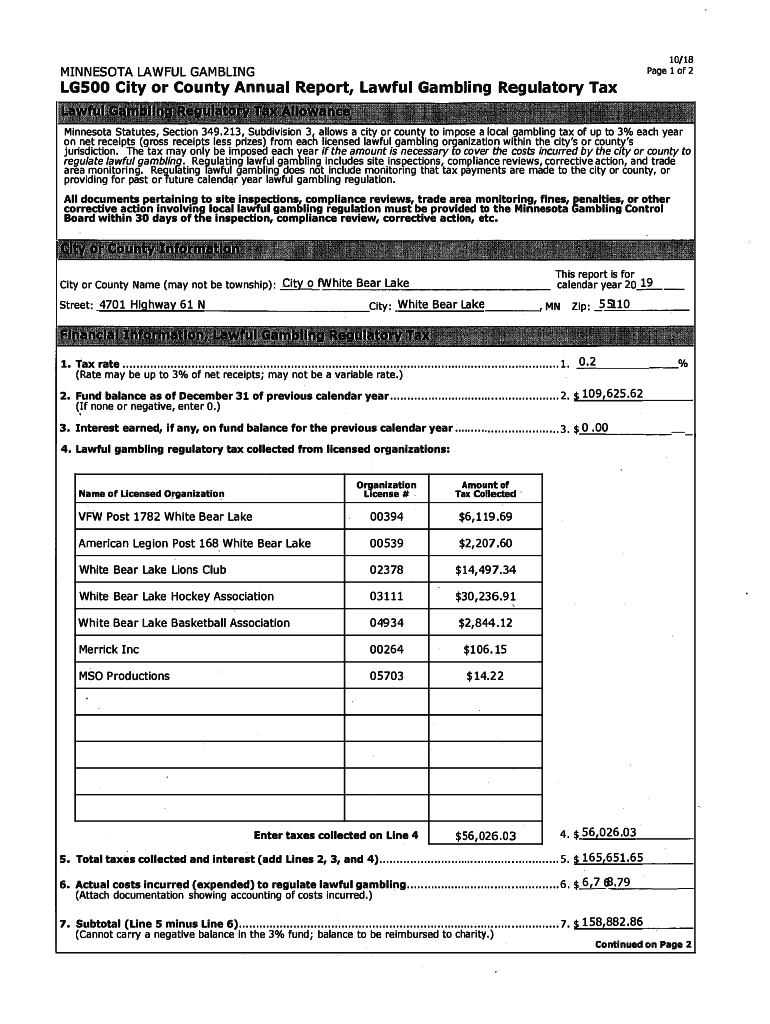 MINNESOTA LAWFUL GAMBLINGLGS00 City or County Annual Report, Lawful Gambling Regulatory Tax10/18-Page 1 of 2Minnesota Statutes, Section 349.213, Subdivision 31 allows a city or county to impose a