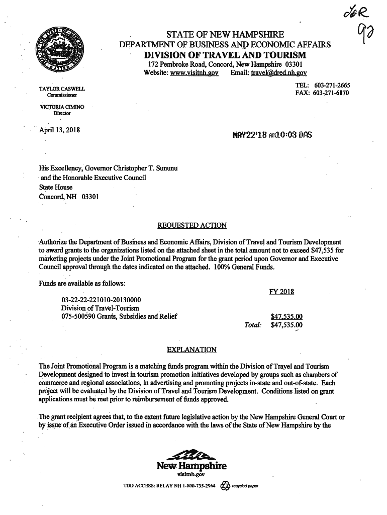 STATE OF NEW HAMPSHIRE DEPARTMENT OF BUSINESS AND ECONOMIC AFFAIRS.DIVISION OF TRAVEL AND TOURISM 172 Pembroke Road, Concord, New Hampshire 03301 Website: www.visitnh.gov Email: travel died.NH.gov