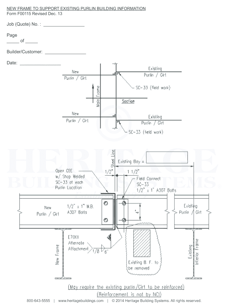 NEW FRAME TO SUPPORT EXISTING PURLING BUILDING INFORMATION Form F00115 Revised Dec. 13Job (Quote) No. Page of Builder/Customer: Date: 8006435555 www.heritagebuildings.com 2014 Heritage Building Systems.