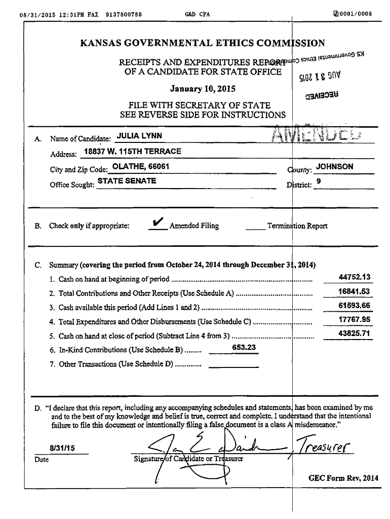 08/31/2015 12:31PU FAXI4J 0001/0008G&D CPA9137800789IKANSAS GOVERNMENTAL ETHICS COMM SCION RECEIPTS AND EXPENDITURES REP OF A CANDIDATE FOR STATE OFFICE January 10, 2015, FILE WITH SECRETARY OF STATE