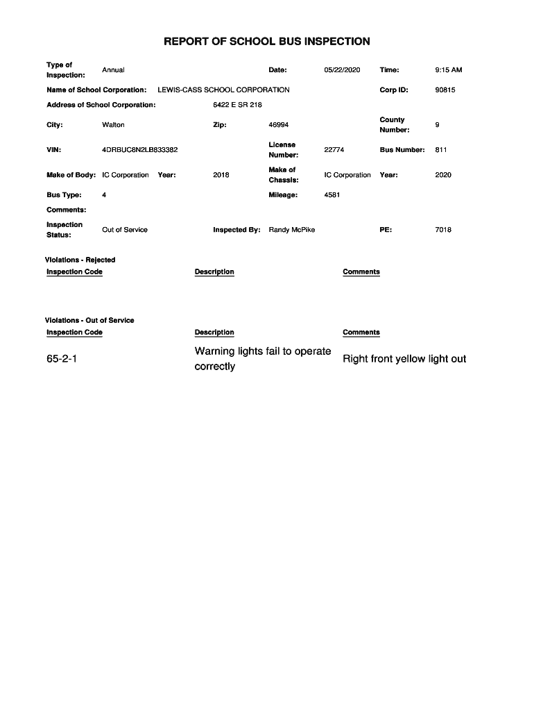 Get the free REPORT OF SCHOOL BUS INSPECTION 65-2-1 Warning lights fail ... - secure in
