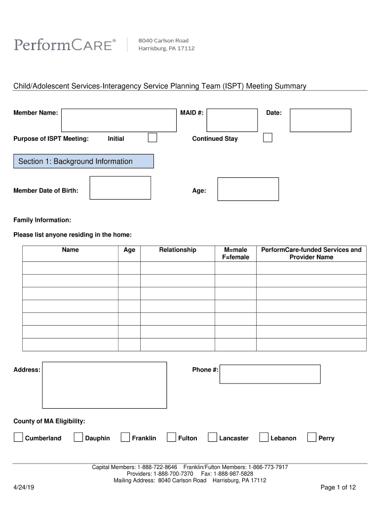 Child/Adolescent ServicesInteragency Service Planning Team (ISP) Meeting SummaryMember Name:MAID #:Purpose of ISP Meeting:Date:Continued StayInitialSection 1: Background InformationMember Date of