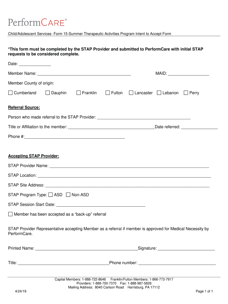 Child/Adolescent Services Form 15Summer Therapeutic Activities Program Intent to Accept Form×This form must be completed by the STAR Provider and submitted to Performer with initial STAR requests