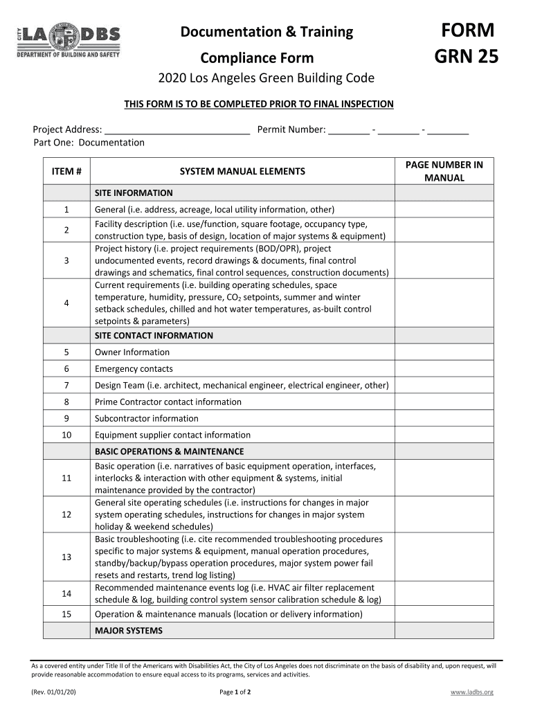 FORM GRN25Documentation&Training ComplianceForm 2020LosAngelesGreenBuildingCode THISFORMISTOBECOMPLETEDPRIORTOFINALINSPECTION ProjectAddress: PermitNumber: Pantone:Documentation ITEM#PAGENUMBERIN