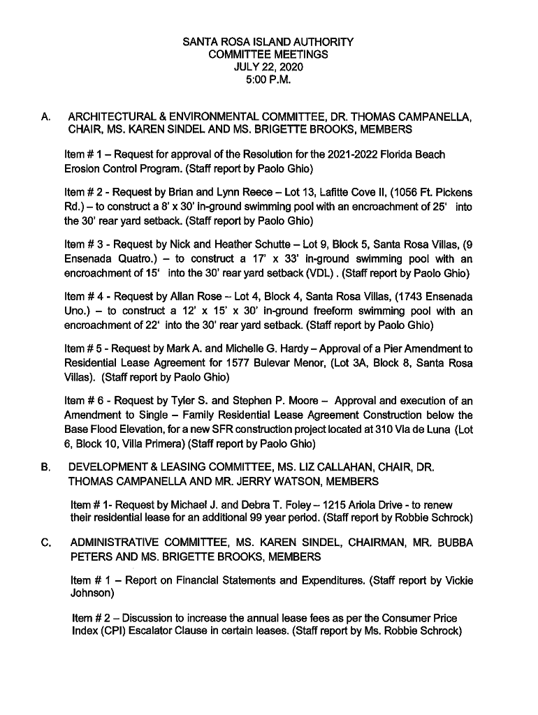 SANTA ROSA ISLAND AUTHORITY COMMITTEE MEETINGS JULY 22, 2020 5:00 P.M.A.ARCHITECTURAL & ENVIRONMENTAL COMMITTEE, DR. THOMAS CAMPANELLA, CHAIR, MS. KAREN SIN DEL AND MS. BRIGITTE BROOKS, MEMBERS Item#