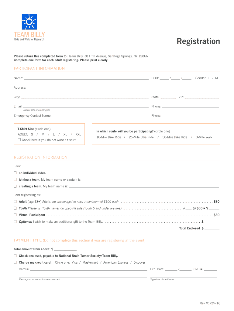 TEAM BILLY Ride and Walk for ResearchRegistrationPlease return this completed form to: Team Billy, 38 Fifth Avenue, Saratoga Springs, NY 12866 Complete one form for each adult registering. Please