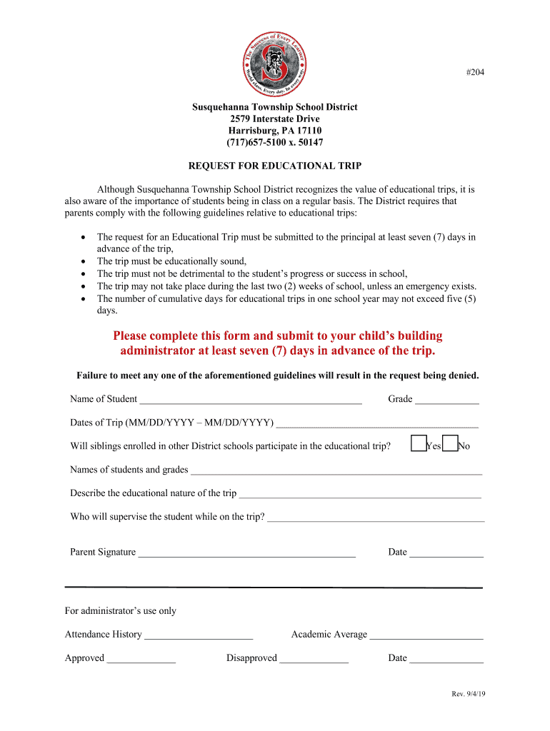 #204Susquehanna Township School District 2579 Interstate Drive Harrisburg, PA 17110 (717)6575100 ×. 50147 REQUEST FOR EDUCATIONAL TRIP Although Susquehanna Township School District recognizes the