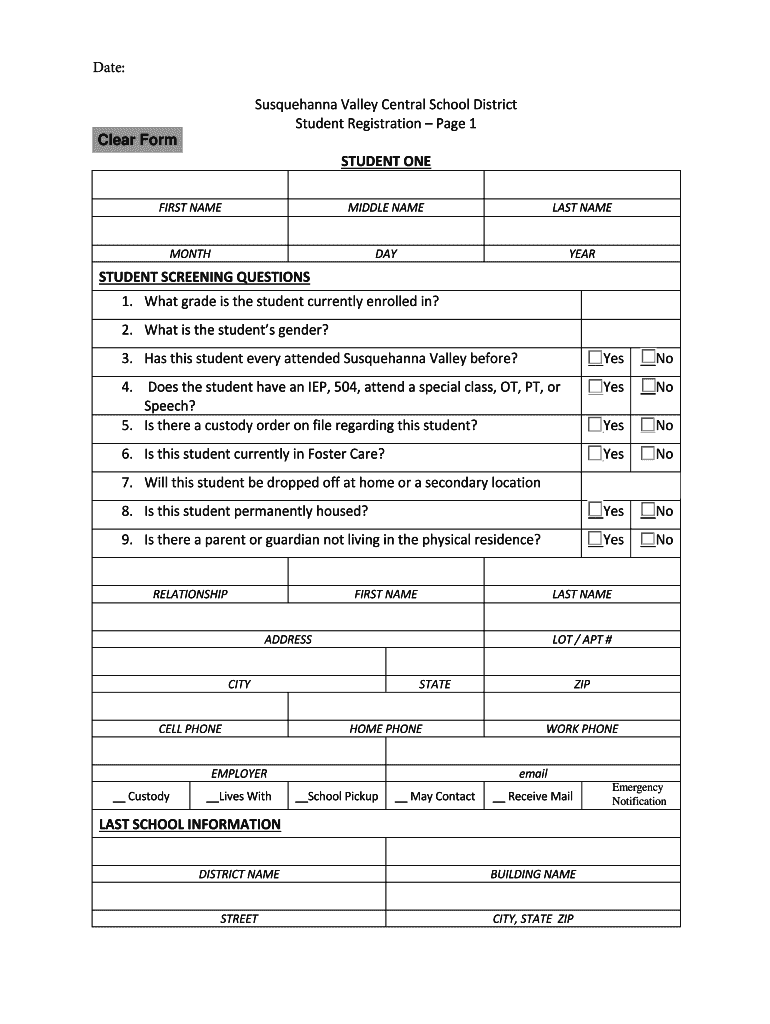 Susquehanna Valley Central School District Student Registration Page 1 Clear Form STUDENT ONE FIRST NAMEMIDDLE NAMELESS NAMEMONTHDAYYEARSTUDENT SCREENING QUESTIONS 1. What grade is the student currently