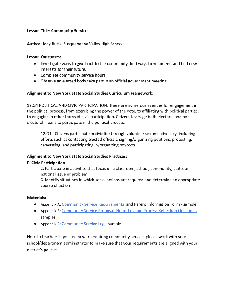 Lesson Title: Community Service Author: Jody Butts, Susquehanna Valley High School Lesson Outcomes: Investigate ways to give back to the community, find ways to volunteer, and find new interests in