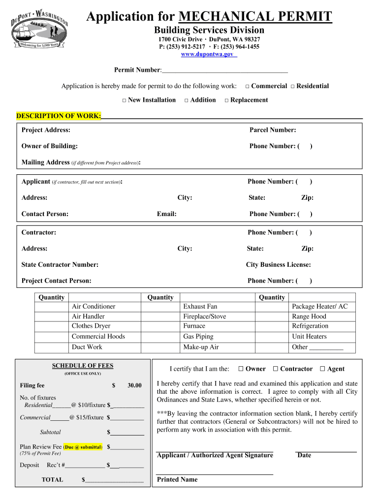 Application for MECHANICAL PERMIT Building Services Division 1700 Civic Drive DuPont, WA 98327 P: (253) 9125217 F: (253) 9641455 www.dupontwa.govPermit Number: Application is hereby made for permit