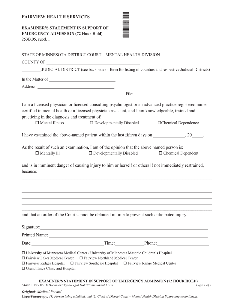 FAIRVIEW HEALTH SERVICES EXAMINERS STATEMENT IN SUPPORT OF EMERGENCY ADMISSION (72 Hours Hold) 253B.05, sub. 1STATE OF MINNESOTA DISTRICT COURT MENTAL HEALTH DIVISION COUNTY OF JUDICIAL DISTRICT (see