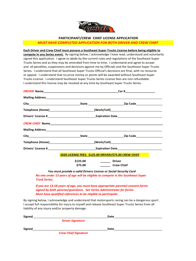 Each Driver and Crew Chief must possess a Southeast Super Trucks License before being eligible